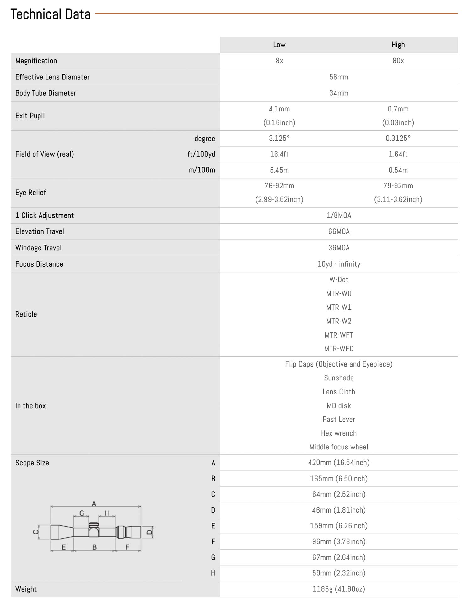 MARCH 8x-80x56 TECHNICAL DATA SHEET & MIL RETICLE CHOICES